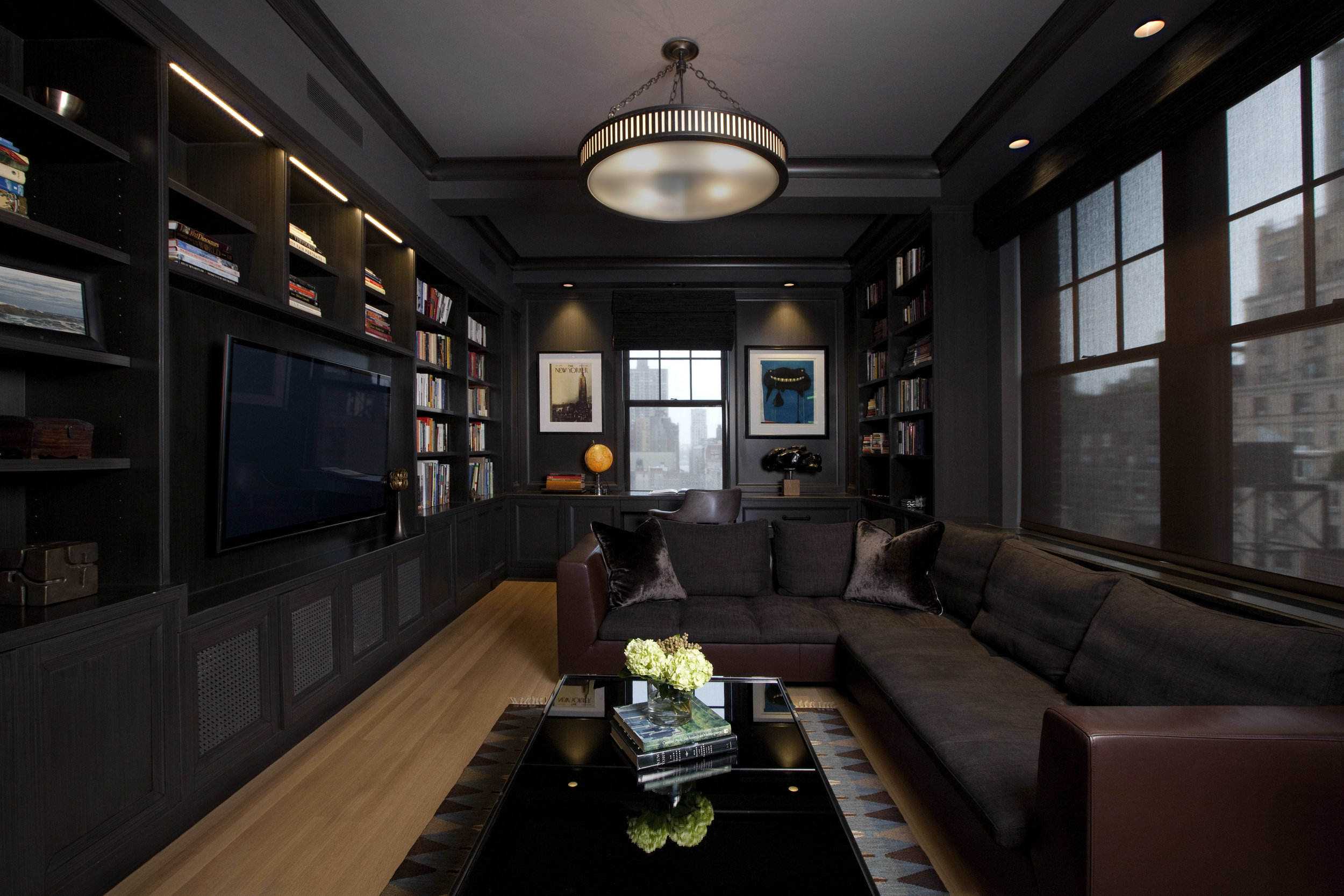 Larry & Aaron* refashioned the original duplex and it's existing layout to infuse new elements while keeping/restoring classic details. A modern kitchen and rich detailed library replace existing while existing bathrooms were enlarged and modernized. Additionally, the former servants’ wing was reconfigured to be a new bedroom suite for a child heading off to college; complete with a private entrance. New storage was added throughout the apartment while keeping the original entertainment and living spaces intact. The windows were all replaced, a central/zoned AC system and A/V package were also coordinated.